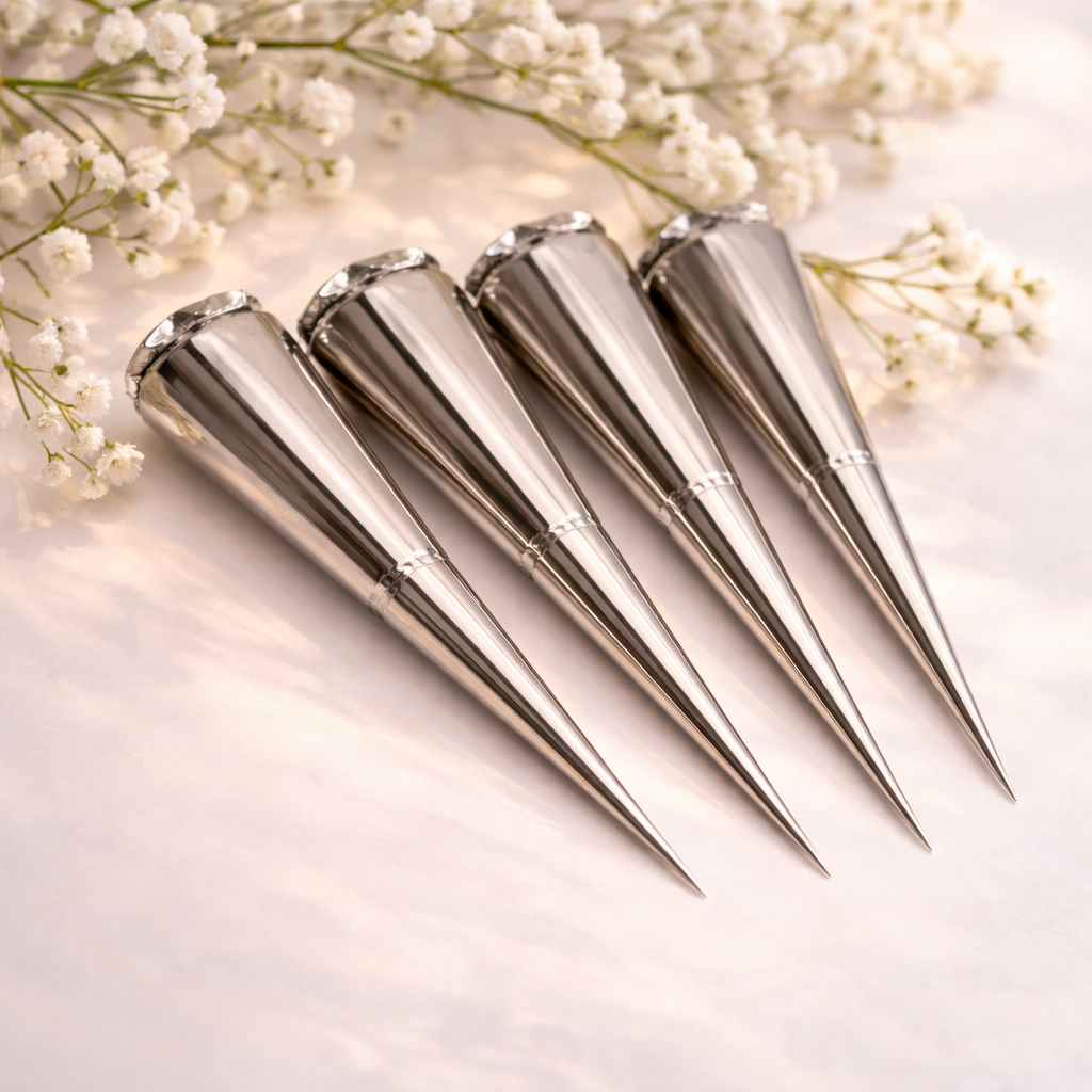 Meenu Henna Diamond Cone delivers a darker, richer stain in less time with its ultra-fine 0.38mm precision tip, designed for flawless detailing. This premium cone is crafted using a proprietary signature blend of certified triple-sifted henna powders and therapeutic-grade essential oils to ensure superior color payoff and long-lasting results.
